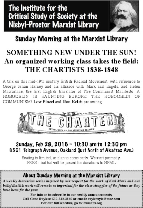 A talk on this mid-19th century British Radical Movement, with reference to George Julian Harney and his alliance with Marx and Engels, and Helen Macfarlane, the first English translator of The Communist Manifesto: A HOBGOBLIN IS HAUNTING EUROPE: THE HOBGOBLIN OF COMMUNISM! Lew Finzel and Ron Kelch presenting.