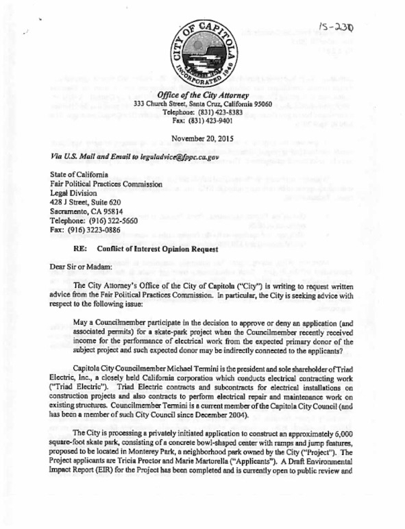 On the exact same day, California's Fair Political Practices Commission issued an advice letter to Heather Lenhardt, Termini's lawyer. Capitola is paying for Termini's legal representation (as if this millionaire couldn't afford it). Based on information she provided, the FPPC concluded that Termini really owns 100% of Triad Electric, which in fact did $17,000 worth of business with NHS. The January 12 FPPC letter can be found here: