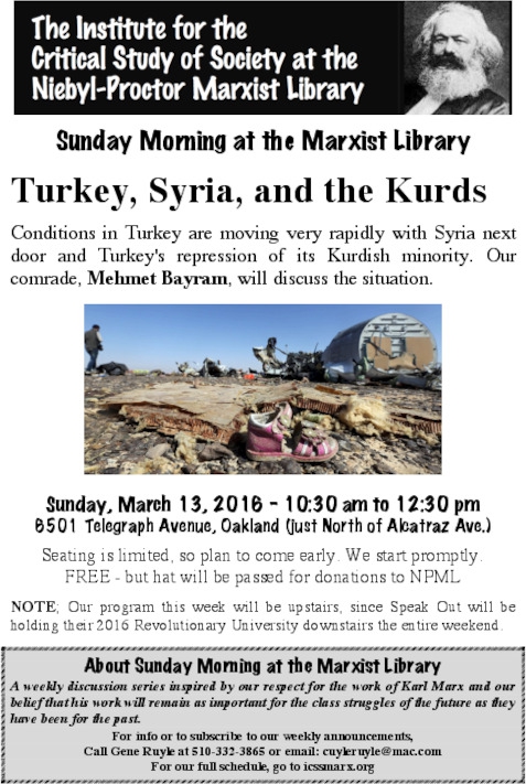 Conditions in Turkey are moving very rapidly with Syria next door and Turkey's repression of its Kurdish minority. Our comrade, Mehmet Bayram, will discuss the situation.