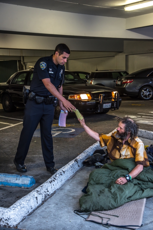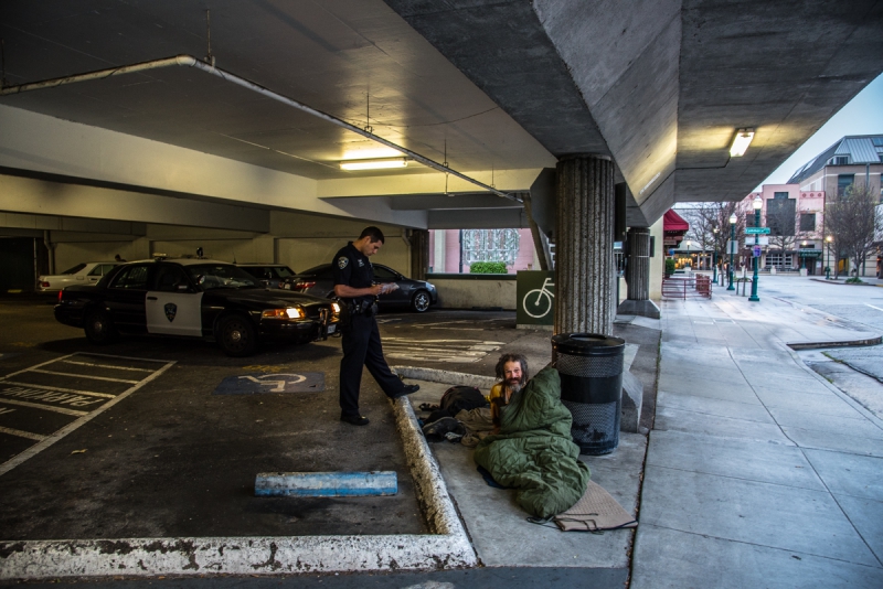 On the rain-swept evening of March 8, the Santa Cruz City Council voted 5-2 to re-affirm the city's camping ban, which outlaws sleeping in public with or without bedding, and prohibits sleeping in cars, between the hours of 11pm and 8:30am. Supporters of the "Right to Rest" had hoped the city council would remove references to the word "sleep" from the ordinance, but the majority of council members voted to keep the law exactly as it is presently written. Shortly after the vote concluded, it was business as usual for the Santa Cruz Police Department, whose officers spent the evening issuing citations and targeting homeless people sleeping downtown. [Top photo: SCPD officer Nicholas Kramer issues a camping citation to a man sleeping along Walnut Avenue at 6:45am on March 9, following the city council's vote to re-affirm the camping ban about eight hours earlier.]