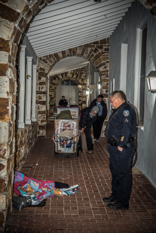 Shortly after 3am, SCPD Sergeant Bill Azua and officer David Gunter arrived at Santa Cruz City Hall after they were called by a First Alarm security guard to eject a single woman who was sleeping under the building's eaves on the brick walkway that leads up to the city's main offices. The security guard had begun to clear the walkway of three other sleepers seeking shelter from the rain, but was unsuccessful in his attempts to get the woman to leave. She did leave, however, after Azua spoke with her.
