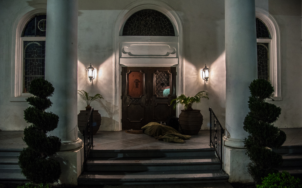 One of the homeless men moved along from City Hall at 3am by First Alarm and the Santa Cruz police eventually made his way about a half a block away to the front entrance of the Prophet Elias Greek Orthodox Church, where he slept until daybreak.
