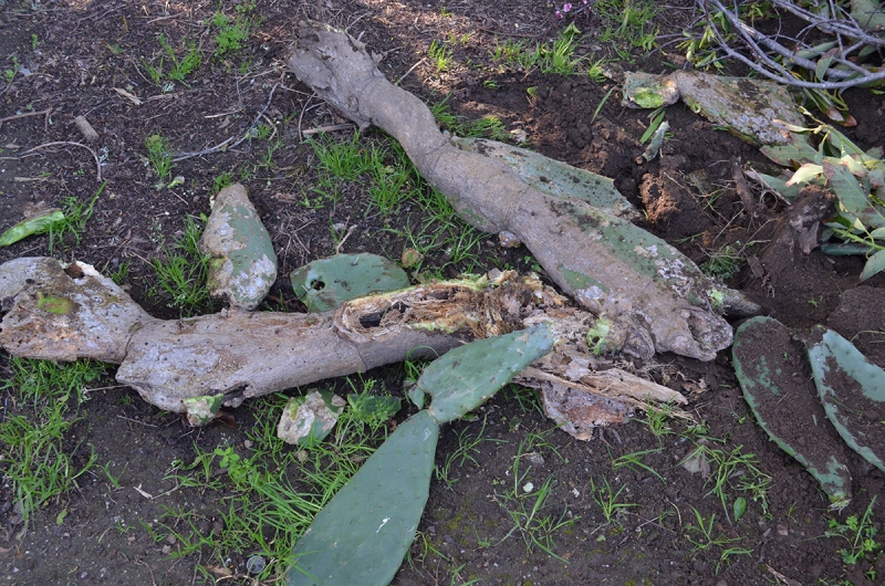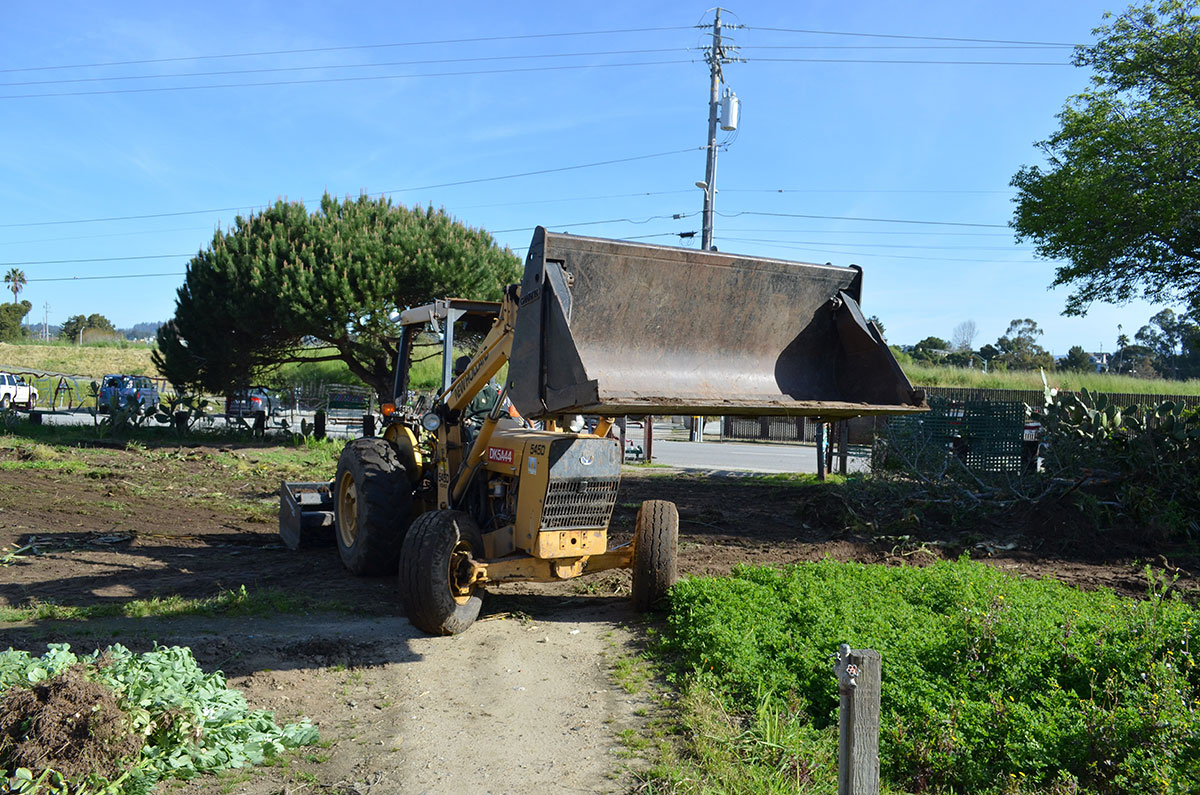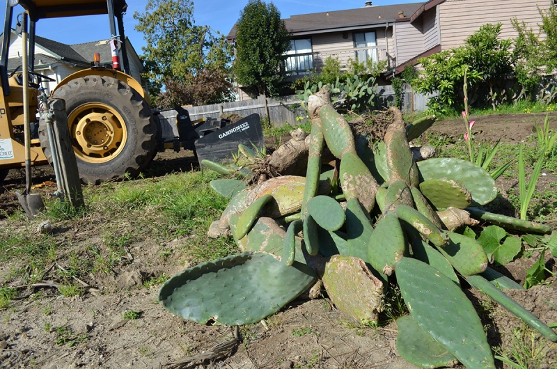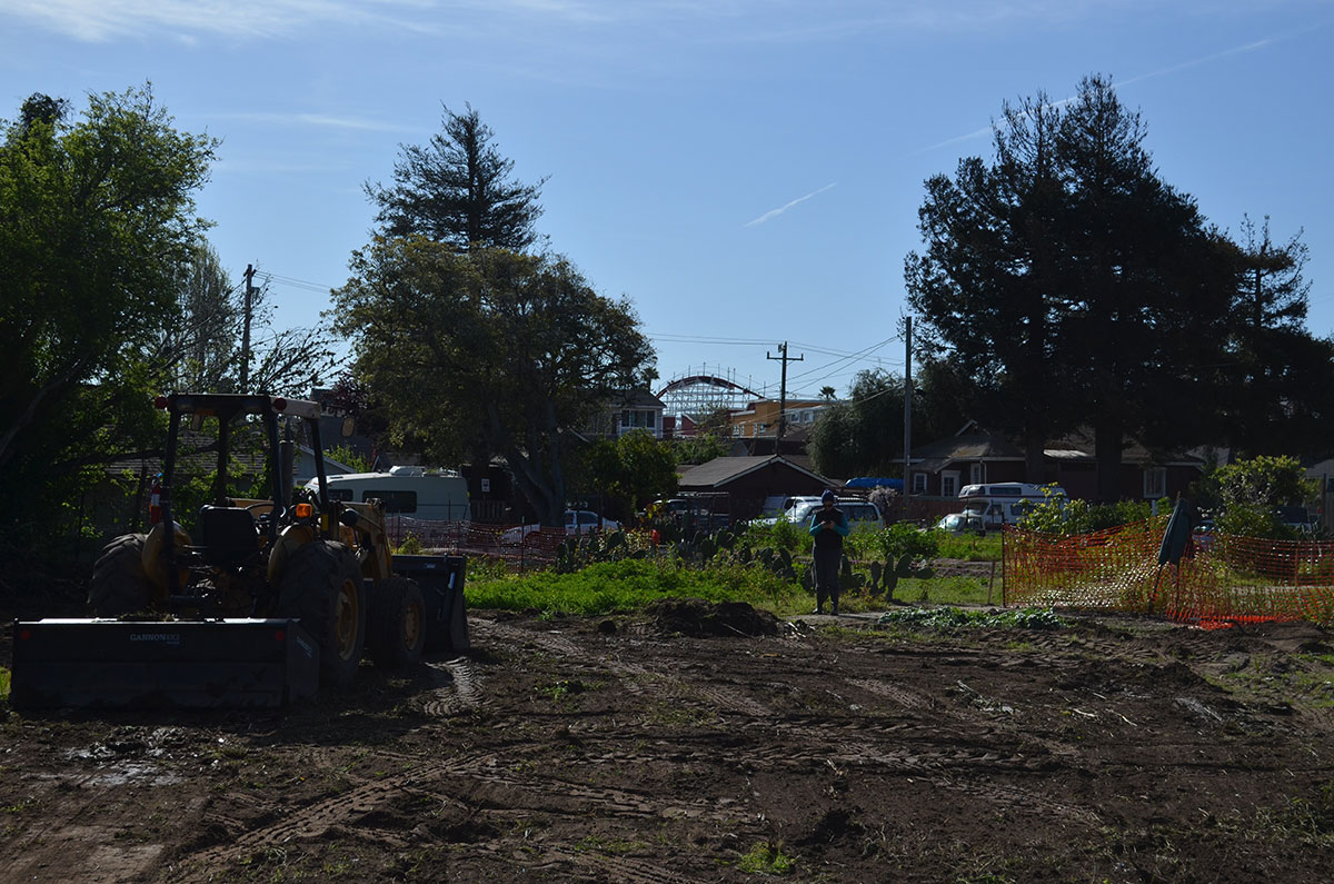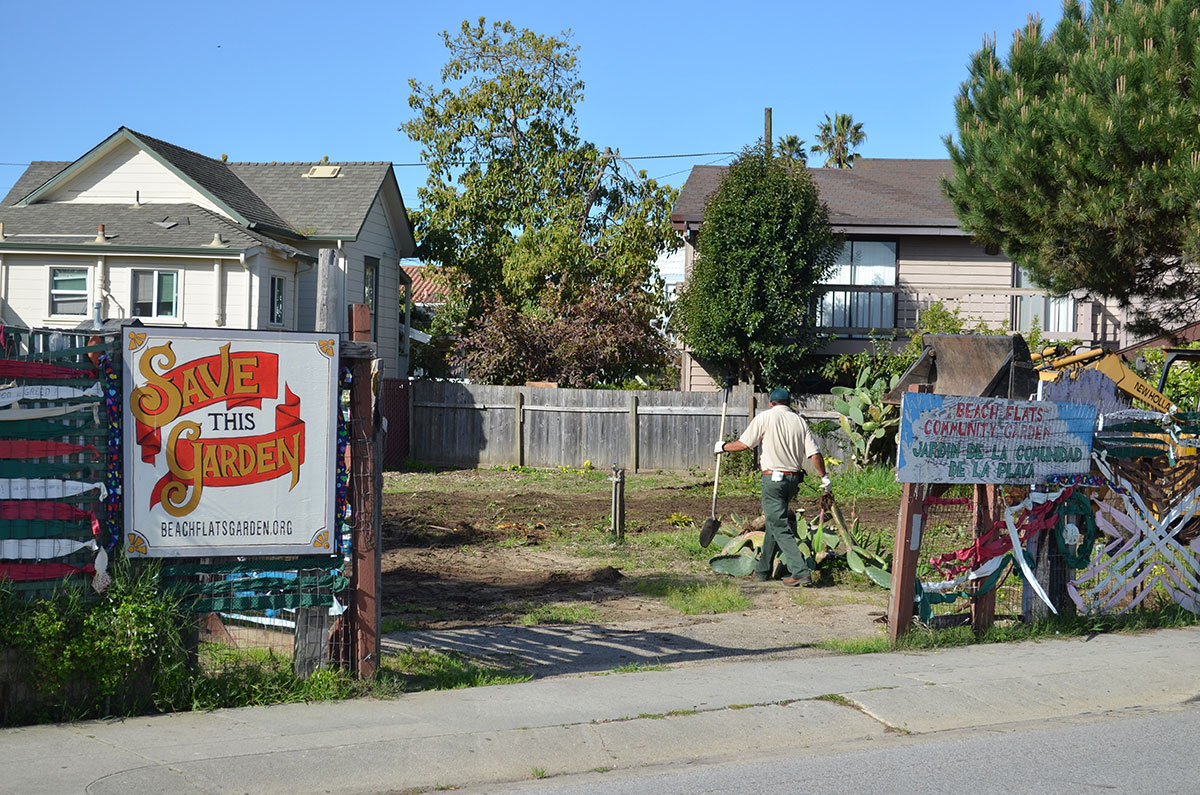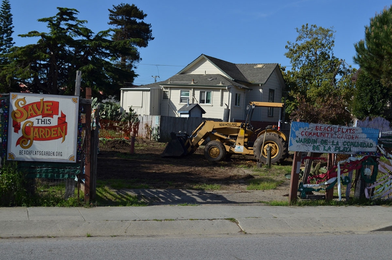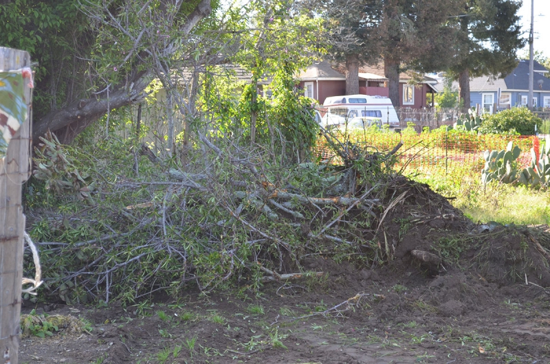 City of Santa Cruz Staff used heavy machinery to uproot and destroy mature fruit trees and nopales today (March 24, 2016). Topsoil compaction from the bulldozers will do irreparable harm to the precious garden microbes that make the beach flats garden soil so abundant.