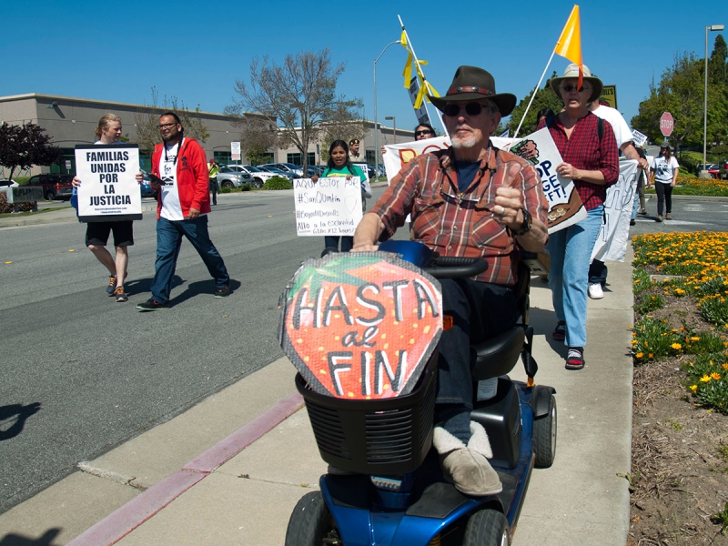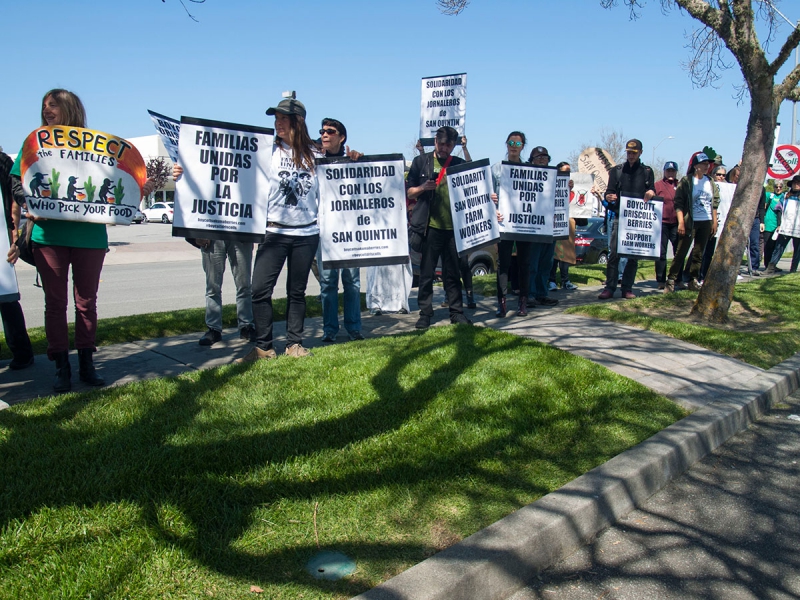 March 31 is the birthday of Cesar Chavez. This year on that date, March 31, 2016, Familias Unidas por la Justicia (FUJ), an independent farmworker union based in Burlington, Washington, led a demonstration at Driscoll’s headquarters in Watsonville, California to promote the ongoing international boycott of Driscoll’s berries. The workers were in Watsonville as part of a month long tour throughout Oregon and California to build a boycott on the scale of the grape boycott of the 1960s that can win union contracts for berry pickers in both Washington state and San Quintín, México.