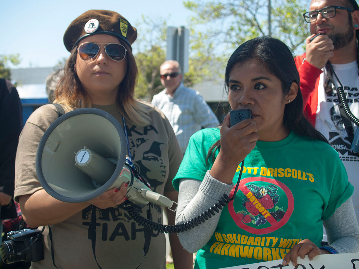 [ Women amplify the call for a global boycott of Driscoll’s berries at Driscoll’s headquarters in Watsonville, California. March 31, 2016. Photos by Bradley Allen. ]
