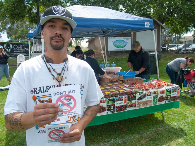 [ Michael Garcia of the Watsonville Brown Berets holds a boycott Driscoll’s flyer in front of the Driscoll’s booth at Watsonville Earth Day. April 24, 2016. ]