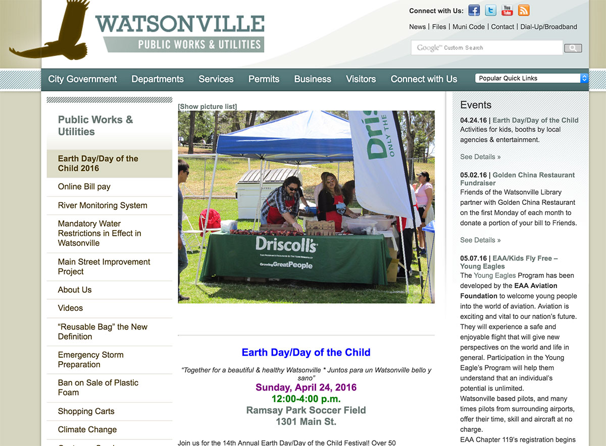 As a top tier platinum sponsor of Watsonville's Earth Day 2016, Driscoll's presumably donated between $2,500 and $5,000. All donations made to the City of Watsonville for the public event are tax deductible. One nice perk for Driscoll's, unethical though typical, was that local schools engaged in direct marketing for the company to distribute 10,000 color print flyers to students featuring the Driscoll's logo.