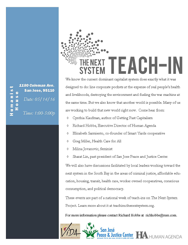 We will also have discussions facilitated by local leaders working toward the next system in the South Bay in the areas of criminal justice, affordable education, housing, transit, health care, worker owned cooperatives, conscious consumption, and political democracy.