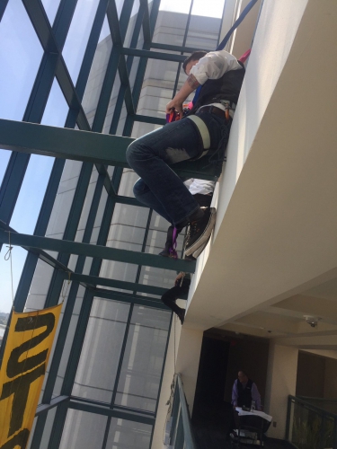 On Friday, Trump was scheduled to speak on the opening day of the California Republican Convention in Burlingame, just south of San Francisco. Protesters came out in force, blocked streets with lockboxes, and pushed through police barricades to rush the Hyatt hotel at which the convention was being held. Trump's motorcade was unable to drive directly to the hotel, so Trump and his entourage were forced to walk from Highway 101 through concrete barriers to reach the convention via a back entrance.