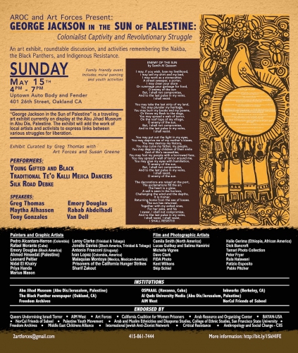 The Arab Resource and Organizing Center (AROC) and Art Forces invite you to join us on May 15th to remember Al Nabka, the Black Panthers, and Indigenous Resistance. This will be a family friendly event with a community mural painting, cultural performances, roundtable discussion and exhibit.