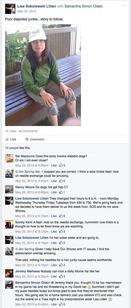 On May 22, 2013, the same program that that was put in place here in Santa Cruz many decades ago to educate, provide connection to counseling, and reduce harm to the general public caused by disease, was directly harassed and cyberbullied by members of TBSC. Prominent TBSC members and admin Samantha Olden, and Lisa Litten dressed up like “junkies” and bragged about their attempts to infiltrate the Street Outreach Supporters. Remember, TBSC's admin approve every single post, and are notorious censors of posts which don't agree with their tactics.