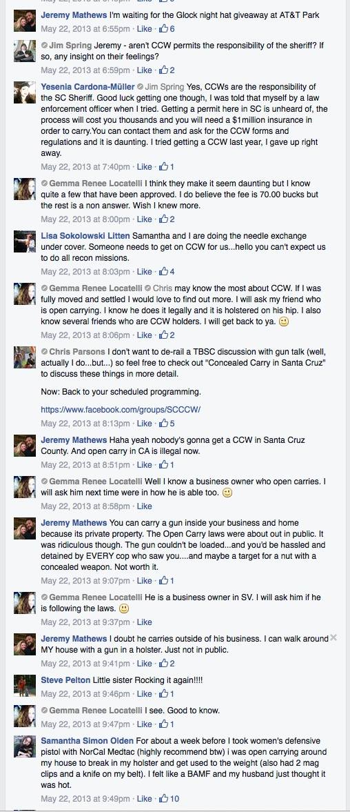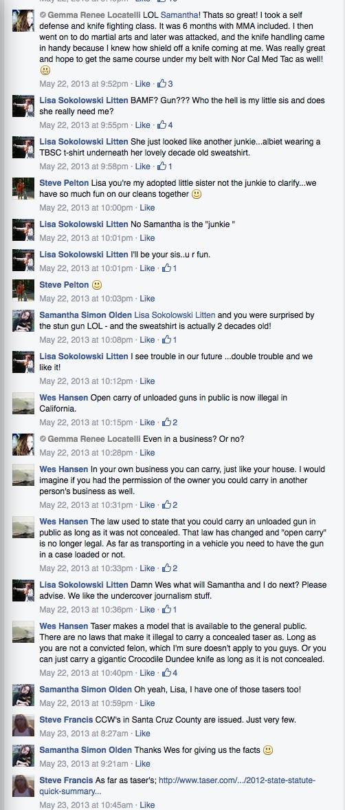 As you can read in the TBSC FB page screenshots below, the conversation documenting Litten and Olden’s exploits quickly devolved into talk about guns, knives, and self defense as if the two were characters in a detective movie. City employees joined the discussion, including the current Santa Cruz Mayor’s son, illustrating just how politically connected TBSC really is.