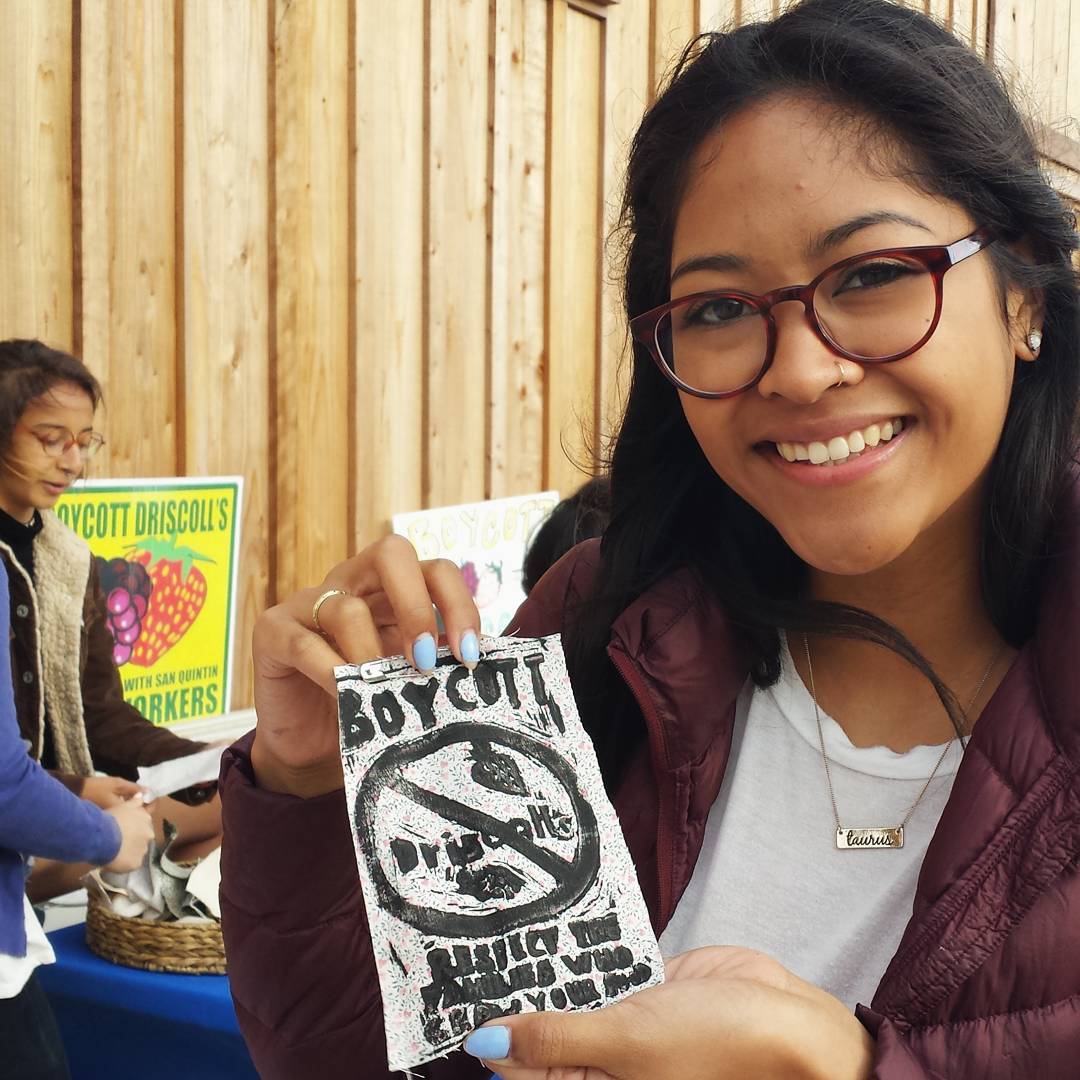 Janessa waited in a long line to make a Boycott Driscoll's patch at UC Santa Cruz during the Strawberry Justice Festival, an annual event held to discuss injustices in the area of strawberry agricultural production.