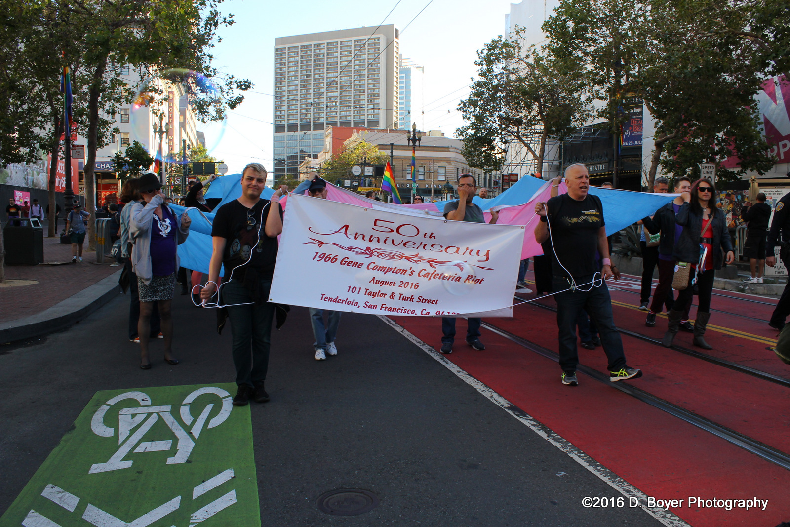 The 12th Trans March was held on Friday June 24, 2016. The theme this year “We Are Still Here Embracing Our Legacy.” Additionally this year is the 50th Anniversary of the Compton’s Cafeteria Riot that occurred in 1966 at the corner of Turk and Taylor streets in San Francisco. Thousands of people marched through the streets of San Francisco loudly proclaiming we are still here. Many allies and friends of transgender people also attended the march. At the end of the march a new sign was revealed at the corner of Turk and Taylor streets in San Francisco. A portion of Taylor Street has been named Compton’s Cafeteria Way.