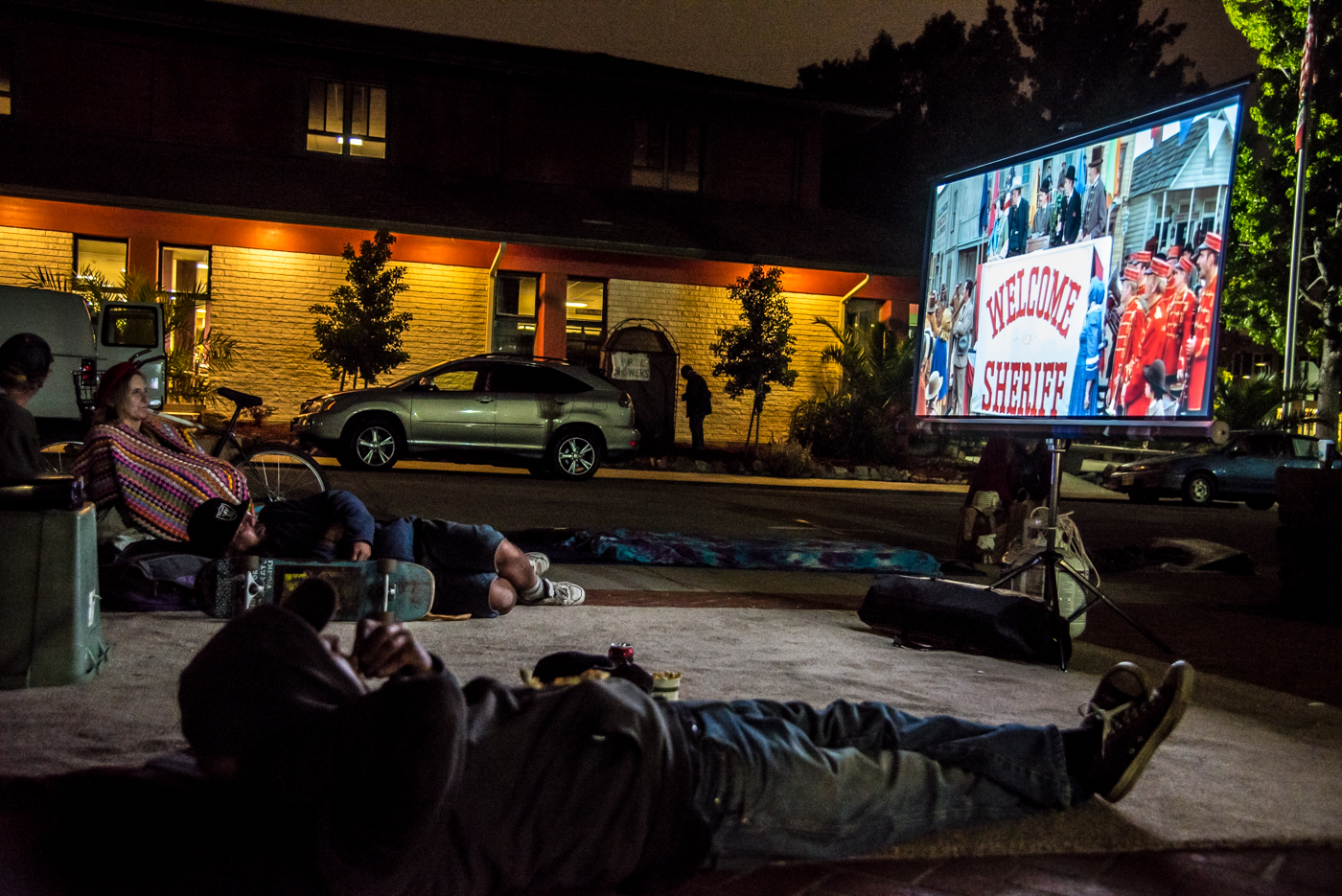 On the evening of their anniversary sleepout, the Freedom Sleepers rented a video projector and a movie screen. At about 10pm they watched the film "Blazing Saddles" together in front of City Hall. The story of a corrupt town council was acutely appreciated by the sleepers, who stayed after the movie for their 52nd community sleepout.