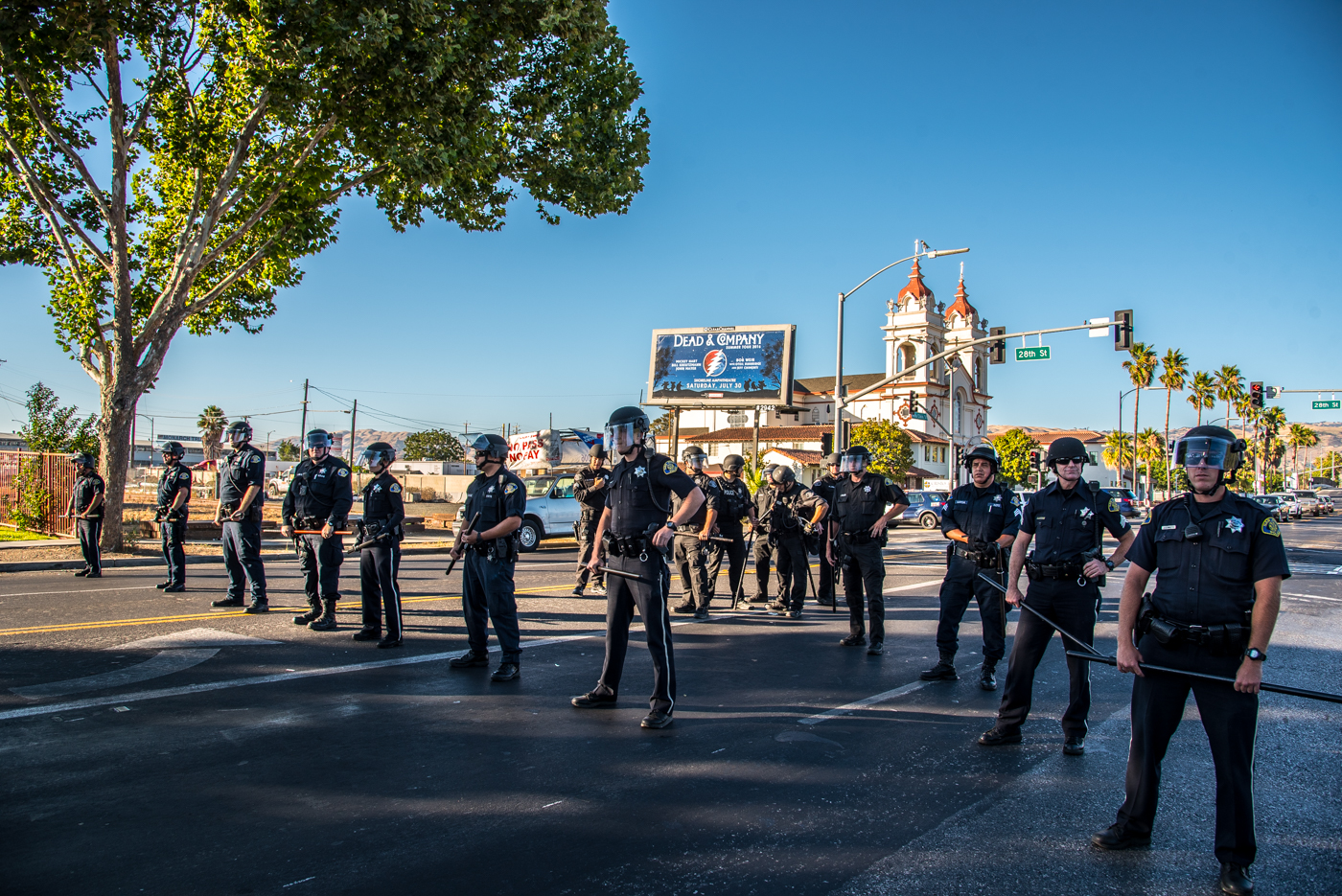 After first gathering at San José City Hall for a rally, with many individuals speaking out and sharing their personal stories of police brutality, community members set out for a march down East Santa Clara Street. A number of San José police officers arrived fairly quickly and exited their vehicles. After changing into riot gear, they jogged ahead of the march to join another group of officers in blocking the street. During a short face-off with the marchers, who wanted to move forward, police identified a person in the middle of the crowd for arrest. After strongly protesting the takedown, which involved several police officers piling on top of the person they targeted, the marchers reversed direction and headed back. They then staged a die-in at city hall, followed by another speak-out.