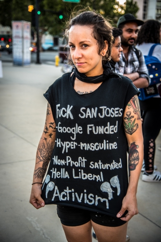 One person was arrested during a march to protest police brutality on July 10 in San José. In solidarity with the Black Lives Matter movement, the protest was organized in response to the police killings of Alton Sterling in Baton Rouge, and Philando Castile in Minnesota, as well as the local killing of Latino youth Anthony Nuñez. Nuñez was killed at his home by officers with the San José Police Department on July 4. [Top photo: A speaker at the protest displays a sign that reads: "Black Lives Matter. Black and Brown. We Stand United." Scroll down for more photos from the rally.]