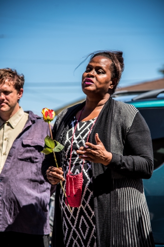 It has become a tradition to celebrate the life of Frank Alvarado with flowers. On July 10, Frank's family was joined by a large group of supporters near the location of his death to mark the second year since his killing by Salinas police. His father, Frank Sr., handed out roses to many of the women gathered, saying the gesture was in memory of "lover boy" as he lightheartedly referred to Frank. His family fondly remembers how dearly Frank loved to give women gifts, and especially the gift of flowers. [Top photo: Frank Alvarado's father, Frank Sr., holds a sign calling on Salinas Mayor Joe Gunter to represent the community. Scroll down for more photos from the memorial for Frank.]