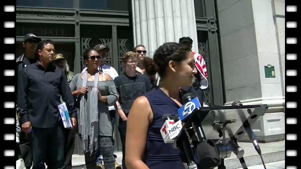 In front of Oakland City Hall on July 11, Leigh Davenport of the Anti Police-Terror Project announced community activists' intention to recall Mayor Libby Schaaf. Primary among the concerns cited as cause for Schaaf's removal from office are her failures: 1) to address the massive displacement of long-time Oakland residents; 2) to support local youth and job centers; and 3) to hold Oakland police accountable for corruption, sexual exploitation, and those they've killed. Also referenced was Schaaf's unconstitutional ban on nighttime protests in May 2015. A full listing of the "dereliction of duties" cited is included below.