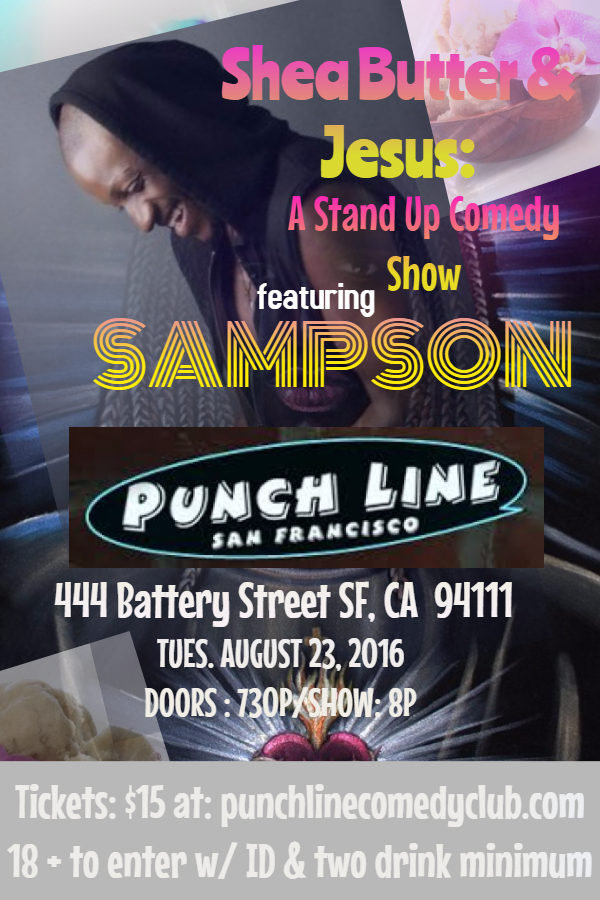 The veteran comic, who is considered a pioneer, and has been performing around the country for well over a decade, will present a concert show “Shea Butter & Jesus: A Stand Up Comedy Show featuring Sampson” to the San Francisco Punch Line Comedy Club 444 Battery Street San Francisco, CA 94111 on Tuesday August 23, 2016 Doors at 730PM Showtime at 8PM.