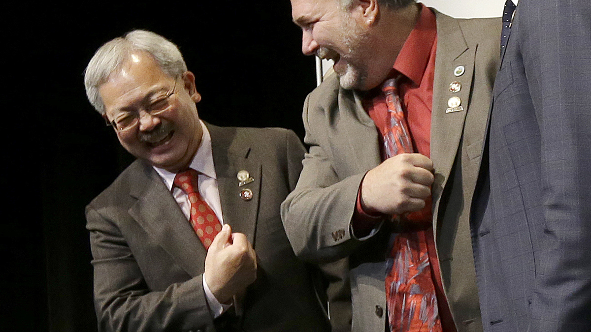 …to this. Yes, he’s prolly going to be a lot more tolerant of the SFPD Police Officers Association than the typical Friscan. And oh, Ed Lee isunpopular these days. (I’ve never seen a photo like this with Our Appointed Mayor used negatively.) And yes, if you’re going to be in Frisco’s dominant political faction in 2016, you’re going to be getting a lot of money from Developers, so that’s fair enough:
