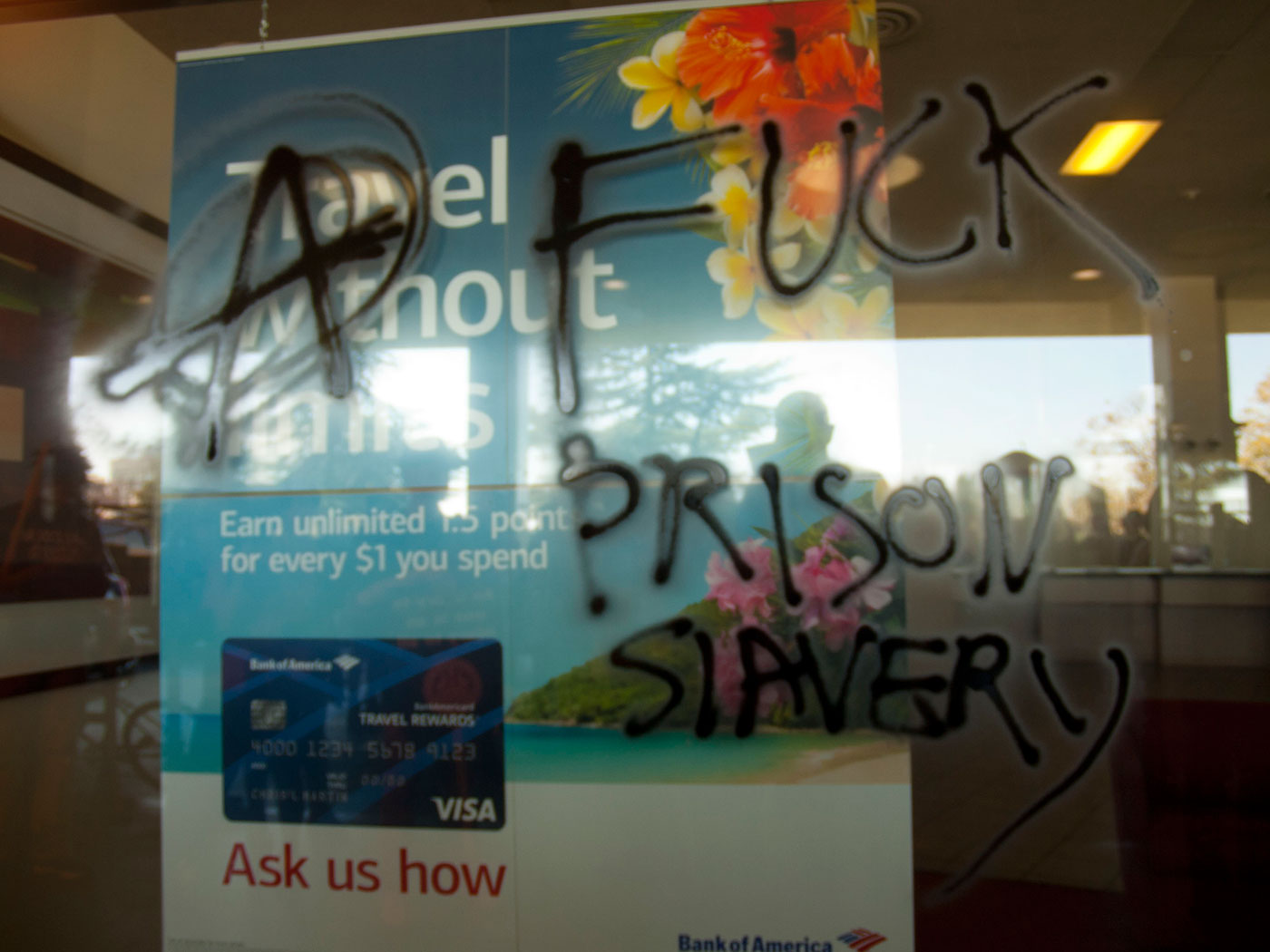 The march then continued to UPS, where more statements were read. Graffiti and stickers also started to go up at the storefronts of these businesses. The march then headed to Bank of America, where the role of the financial giant was discussed over the sound system and a statement from the Free Alabama Movement was also played. Large amounts of graffiti messages went up on the windows of the bank, the ATM was rendered useless, the sign was broken to read ‘Ban America,’ and several windows were broken. During this time the crowd remained very calm, police had kept their distance, and streets in front of the bank remained blocked for about 20 minutes. A mother with her family who wanted to leave when the crowd converged around the bank was given a path and allowed to safely exist. A person in all black with a mask helped clear a path and stated calmly to the kids who looked out the window as their mother drove past, “Remember what you see here today,” while giving a raised fist.
