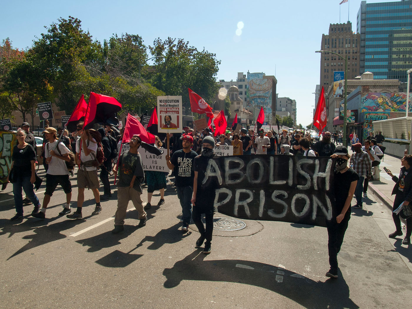 [ Hundreds of demonstrators march through Downtown Oakland on September 10, 2016 in solidarity with the nationwide prison strike. The prisoner work stoppage was organized to begin on September 9, the 45th anniversary of the Attica Uprising. ]