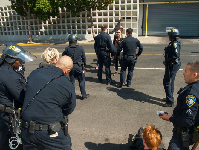 Soon after the large group left Bank of America, they put this in play, as a snatch squad team went after three individuals and targeted them for arrest, leading to a clash between demonstrators and the police. Soon after, police then loaded the three comrades into vans, but then suddenly had a very hard time leaving the area, as rocks were hurdled towards the vans, clashes broke out with the cops, and the crowd followed the vehicles until it made its way back onto the main road.