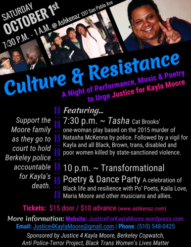 Featuring Cat Brooks' Tasha: a Monologue About Police Terror Victim Natasha McKenna followed by a talk-back, vigil, and Transformational Poetry and Dance Party.