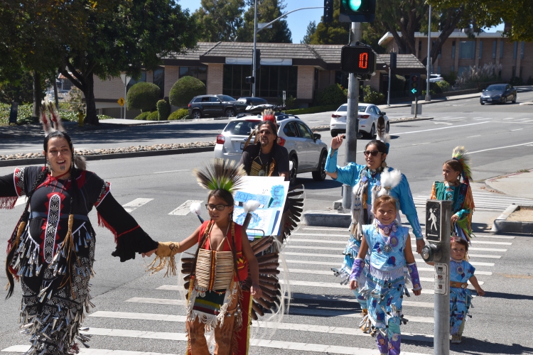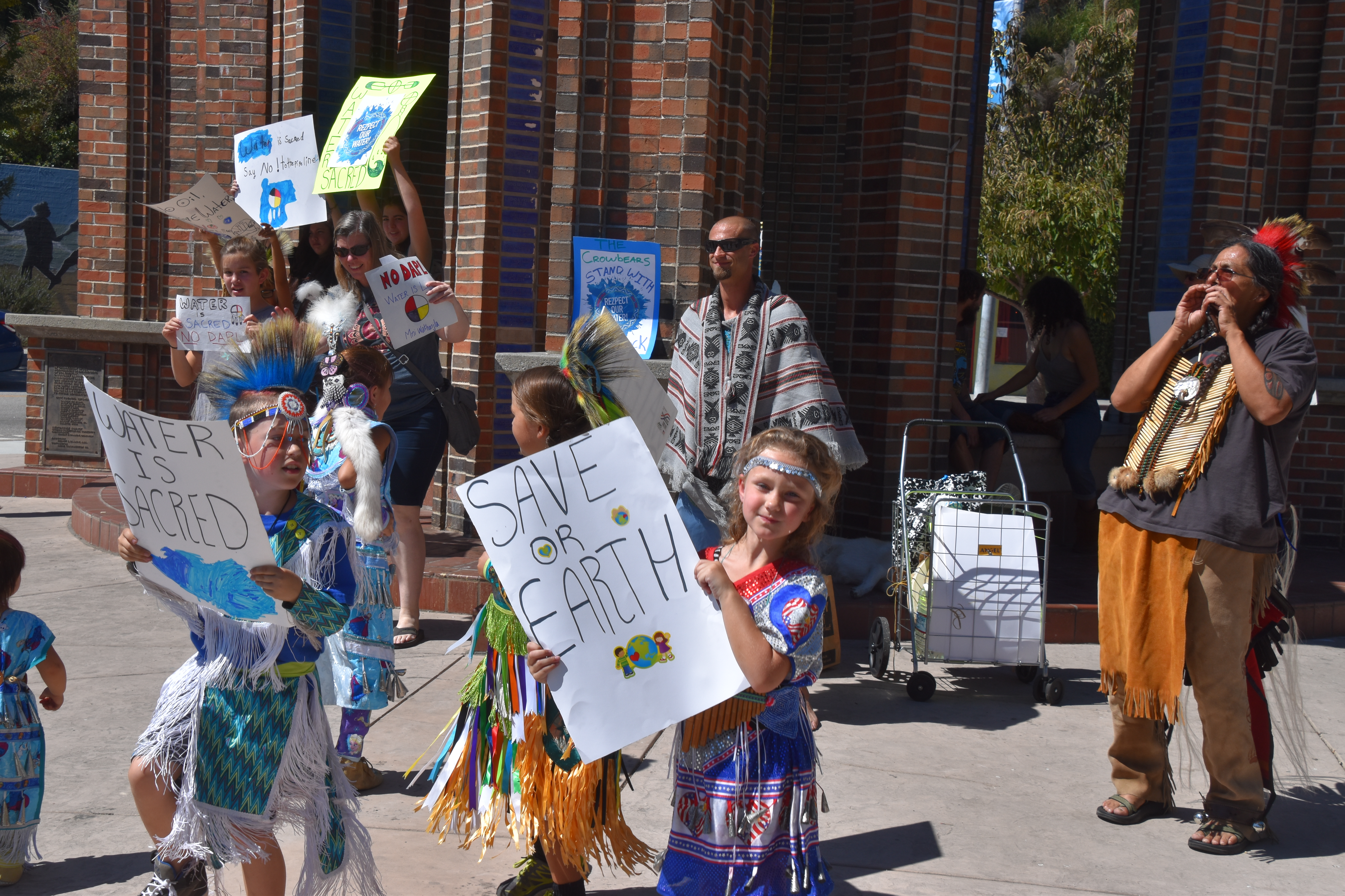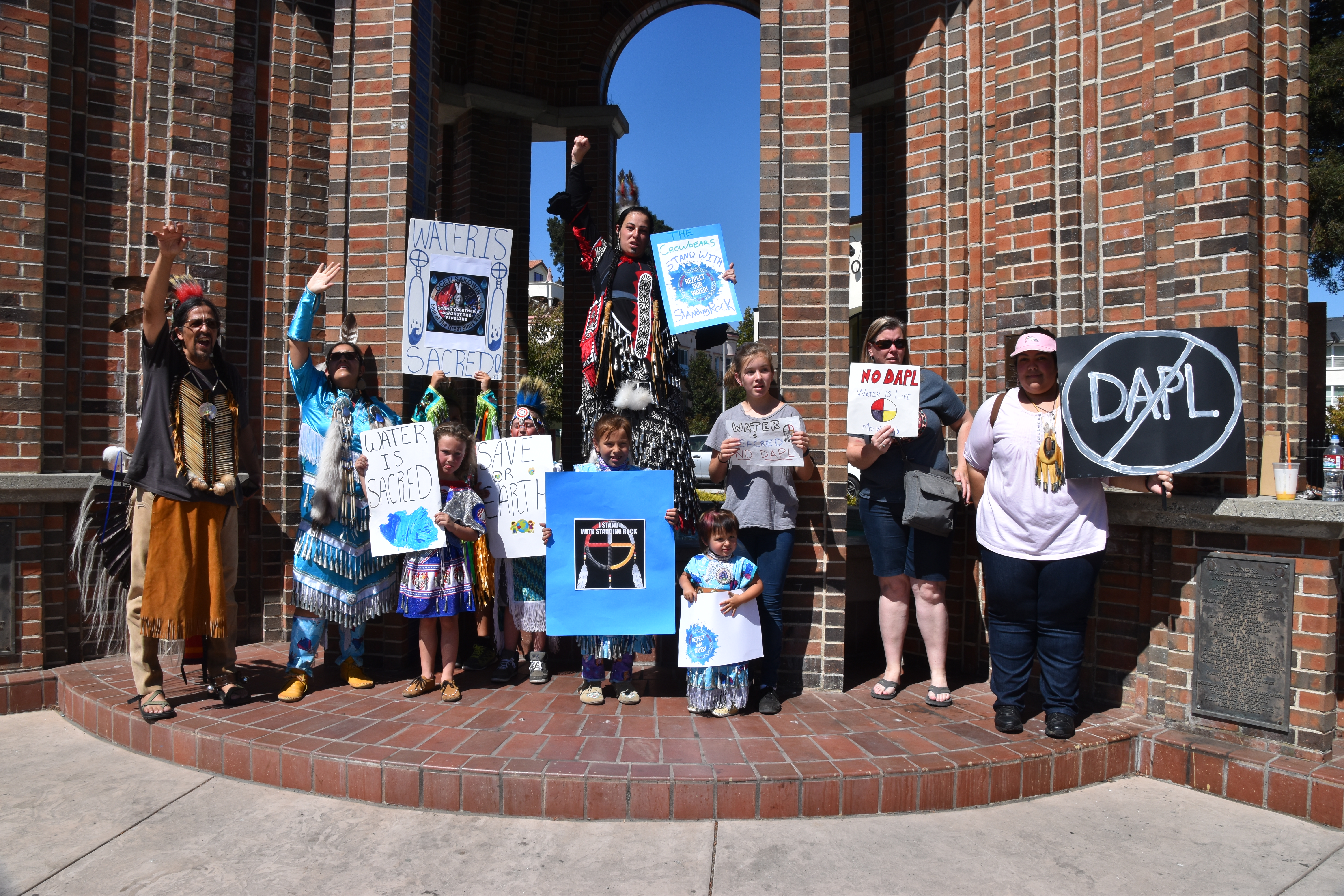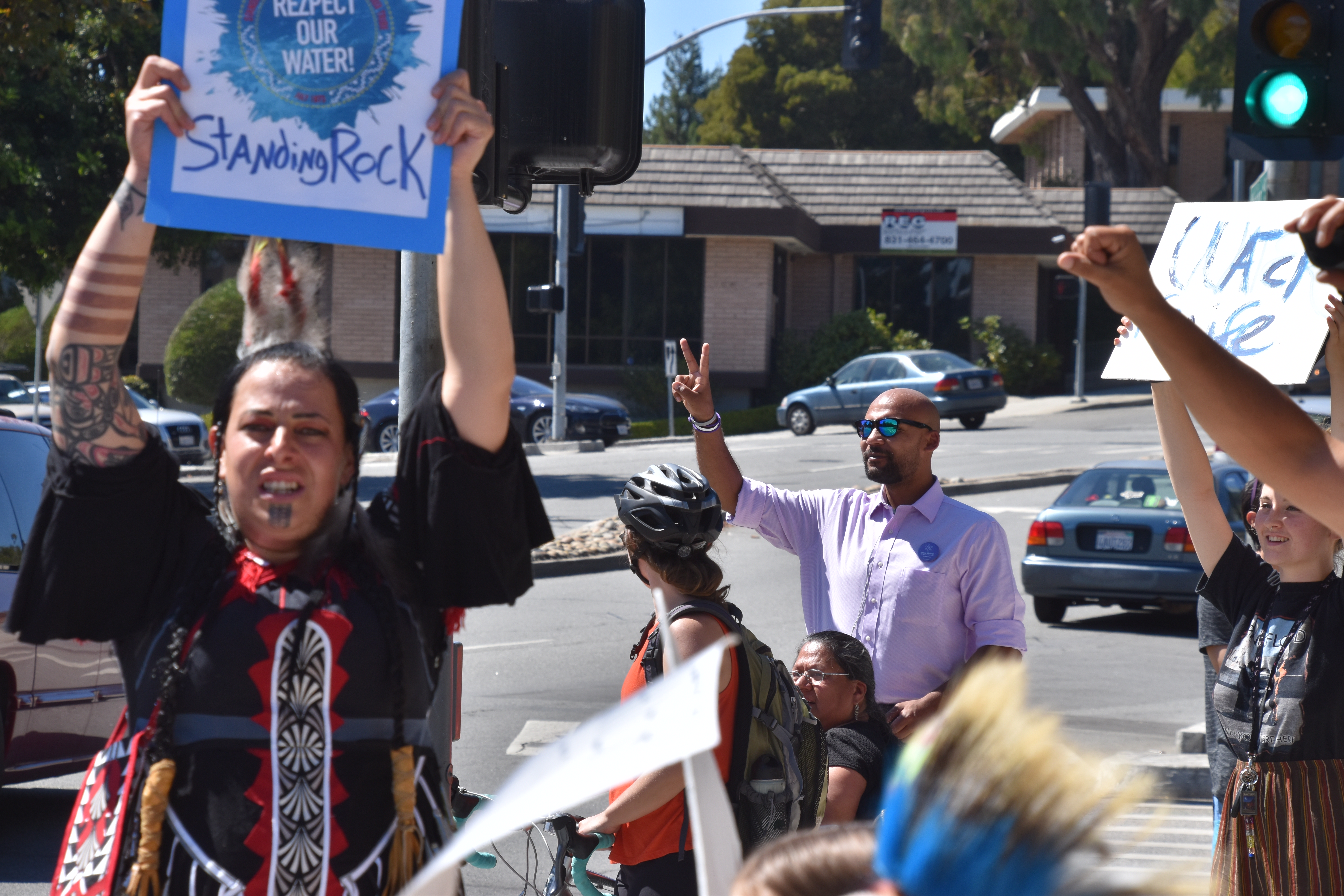 Another day of demonstrating at the town clock in Santa Cruz, Ca. Many of those who came, came in full regalia! Dancing and singing, while many people passing waved and honked there horns!