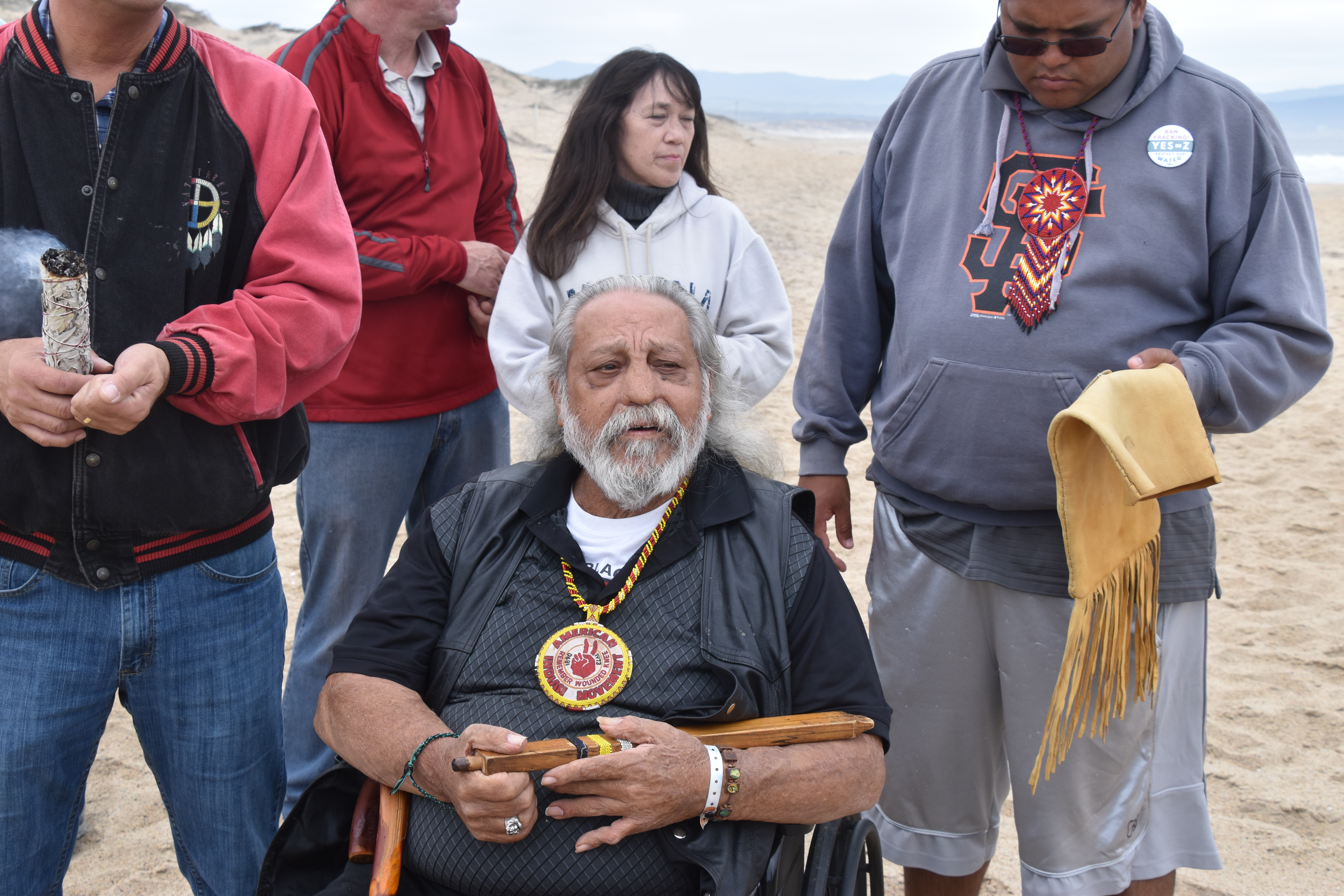 I am so honored to be apart of this beautiful day and being in the presence of Dennis Banks and all these wonderful brothers and sisters who came in support of Yes on Measure Z to ban fracking in Monterey County! A day in prayer for our earth mother and for the halting of our waters being polluted along with our air. Dennis Banks arrived and the AIM song was sung along with the drum!Soon there after Dennis spoke regarding his recent walk against domestic violence, he spoke of his health and the importance of saving our water and banning fracking! He is in support of "Yes on measure Z!" Dennis Banks also prayed for all at Standing Rock! He spoke of his forthcoming meeting with Jerry Brown on Tuesday 10-4-2016 "Bennis Banks was given amnesty in California by then Governor Jerry Brown, who refused to extradite him to South Dakota to face the charges related to activities in the 1973 Custer protest". Some other speakers also spoke on behalf of measure Z
