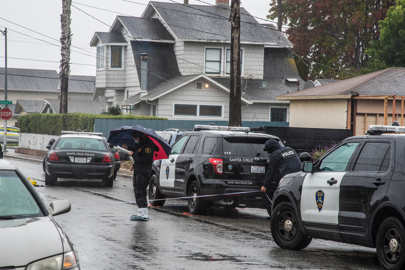 At noon on October 16, police were still processing the scene. A small garden rake could be seen lying on Chace Street, with a numbered evidence marker next to it. In addition to SCPD, deputies with the Santa Cruz County Sheriff's Office were also processing evidence.