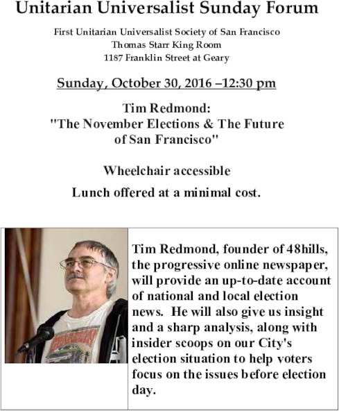 Tim Redmond, founder of 48hills, the progressive online newspaper, will provide an up-to-date account of national, state and local election news. He will also give us insight and a sharp analysis, along with insider scoops on our City's election situation to help voters focus on the really important issues before election day.