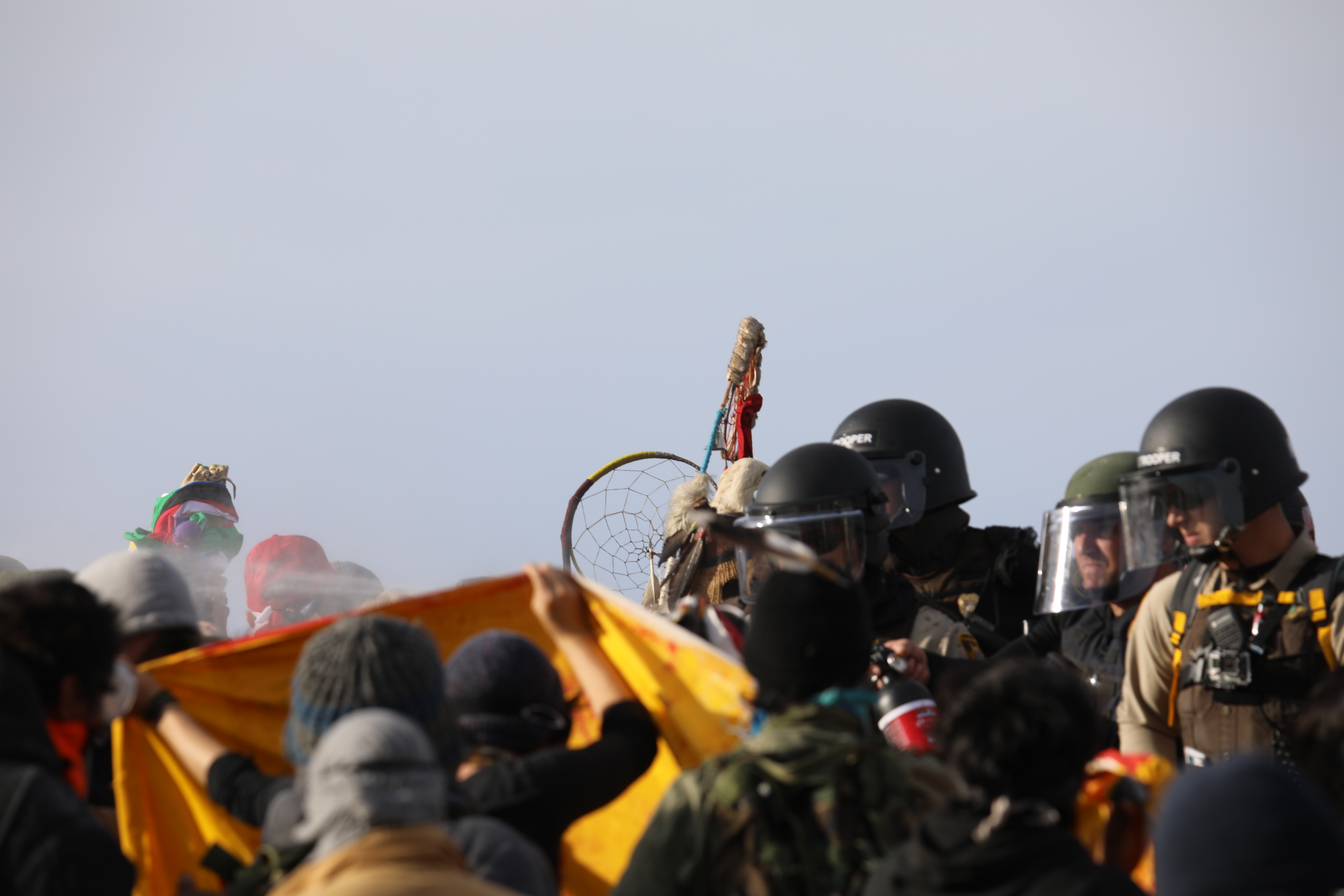 A member of the International Indigenous Youth Council (IIYC) that had her wrist broken during a mass-arrest on October 22nd was hurt again after an officer gripped her visibly injured wrist and twisted it during an attempted arrest. At least six other members of the youth council verified that they had been maced up to five times and were also shot and hit with bean bags. In addition to being assaulted, an altar item and sacred staff was wrenched from the hands of an IIYC member by police. Several other sacred items were reported stolen, including a canupa (sacred tobacco pipe).
