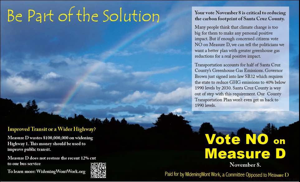 Santa Cruz County residents should vote NO on D and tell the RTC to bring us a better measure in 2018 that doesn't waste money on futile Highway 1 construction but instead spends that money where it will truly improve the commute. It's painful to put the good things on hold for 2 more years, but wasting over $100 million plus bond interest over the next 30 years on false promises just shouldn't be accepted. The RTC can do better for us all. In Santa Cruz County, vote No on Measure D.