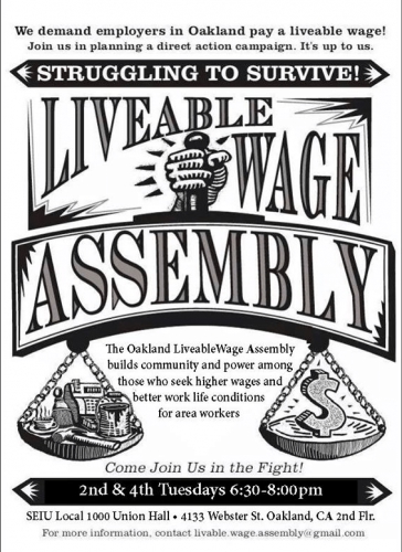 The Oakland Livable Wage Assembly meets every 2nd and 4th Tuesday of the month. Meetings usually take place at the SEIU Local 1000 union hall in downtown Oakland, from 6:30 PM until 8PM, at 436 14th Street, 2nd Floor.