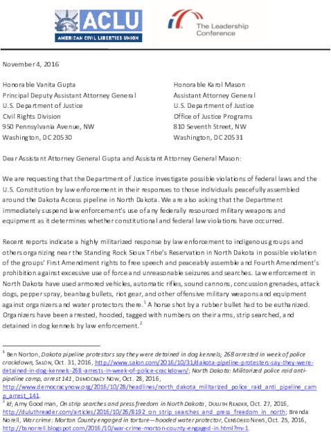 WASHINGTON. November 4, 2016 — The American Civil Liberties Union and the Leadership Conference on Civil and Human Rights sent a letter today to the Justice Department calling for an investigation of possible constitutional rights violations in the police response to peaceful protestors demonstrating against the Dakota Access pipeline.