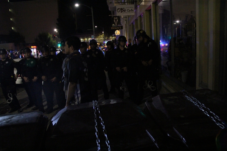 One thought that came to mind that night was the quote from Mao about revolutionaries swimming amongst the fish of the general population. Not that the quote is entirely apt here, but in the days of old, during the early days of the Justice for Oscar Grant movement, for instance, downtown Oakland was a ghost town at night and it was much easier for police to identify and smash on small groups of protesters.
