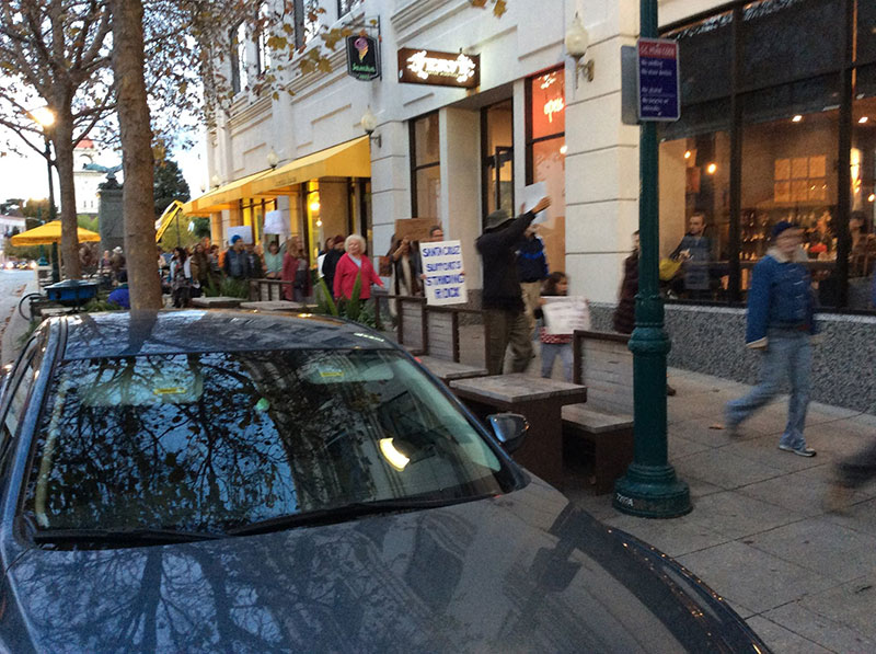 At the end of the march, folks formed a circle held hands in the plaza across from the Post Office where Allegra led the group in prayer and a silent vigil in support of Standing Rock. Other local organizers asked people to join the Santa Cruz Stands With Standing Rock Facebook page and pledged to continue the fight for our brothers and sisters on the front lines in North Dakota as winter approaches.