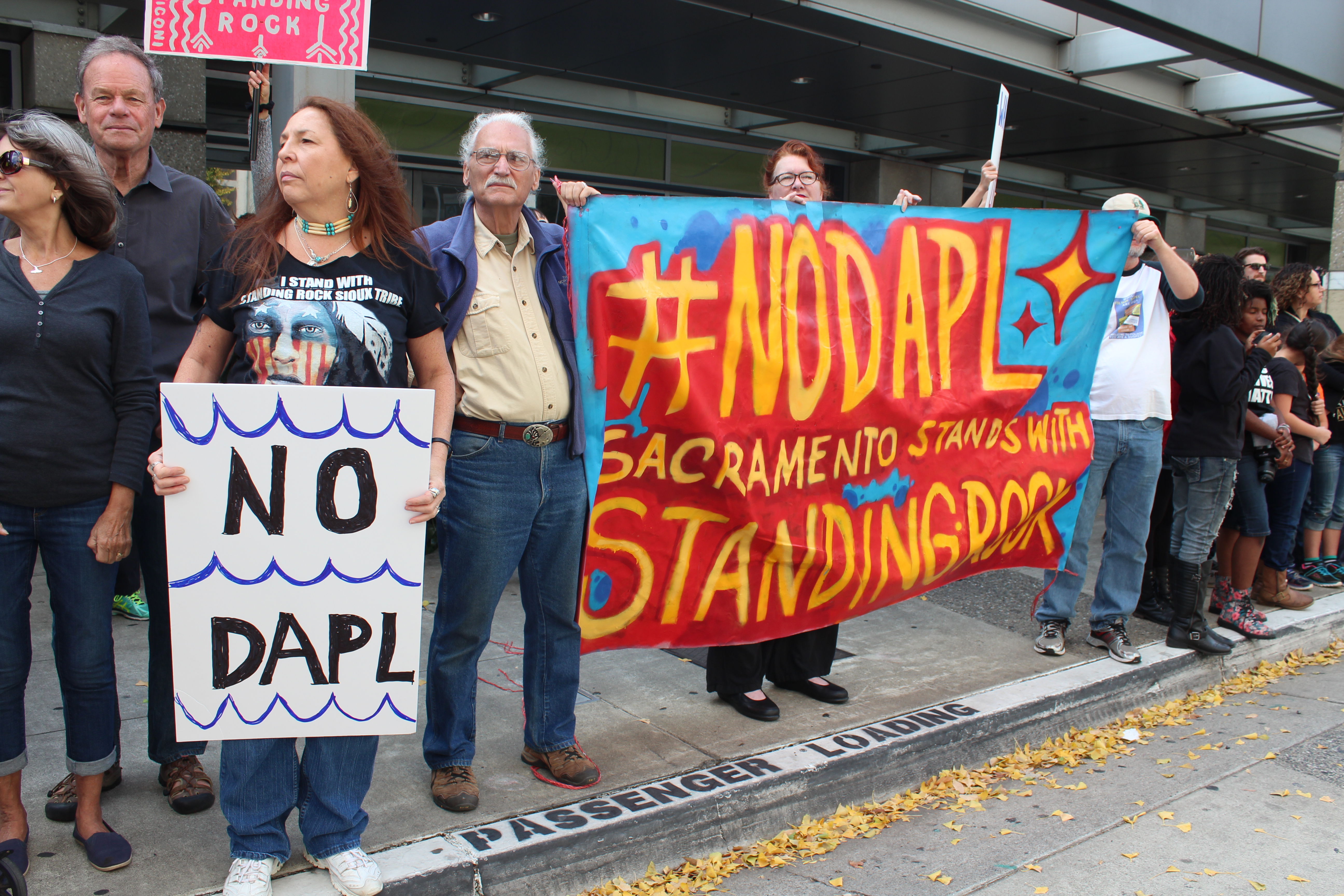 They lined both sides of the street in front of the U.S. Army Corps of Engineers office on J Street, proclaiming their solidarity with the struggle of Standing Rock Sioux Tribe in North Dakota and their allies to stop the pipeline that carries fracked crude Bakken oil. Many drivers passing by on the busy street honked their horns in support of the protesters.