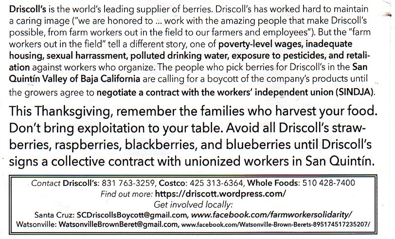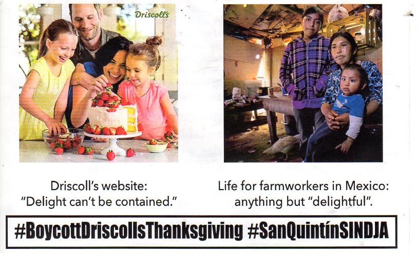 Don't bring fruits harvested with exploitation to your Thanksgiving tables, including Driscoll's-brand strawberries, raspberries, blackberries, and blueberries. The cheerful Driscoll's labels and delightful promotions hide the following realities that farmworkers face each day:
