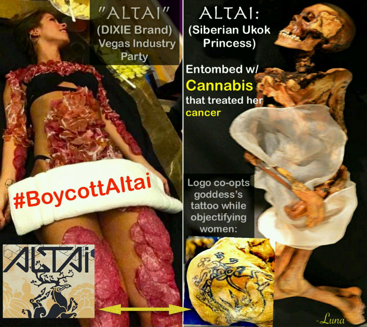 Calls to boycott Altai Brands began after a disturbing photo was circulated on social media showing a nearly nude woman laying on a table covered in slices of salami and other meats. In addition to being surrounded by slices of cheese, the photo also shows people holding drinks while standing near the woman. The event, hosted by Altai Brands, was a private after-party on November 17 for the fifth annual Marijuana Business Conference and Expo which took place from November 15-18, 2016 at the Rio All-Suite Hotel & Casino in Las Vegas, NV.