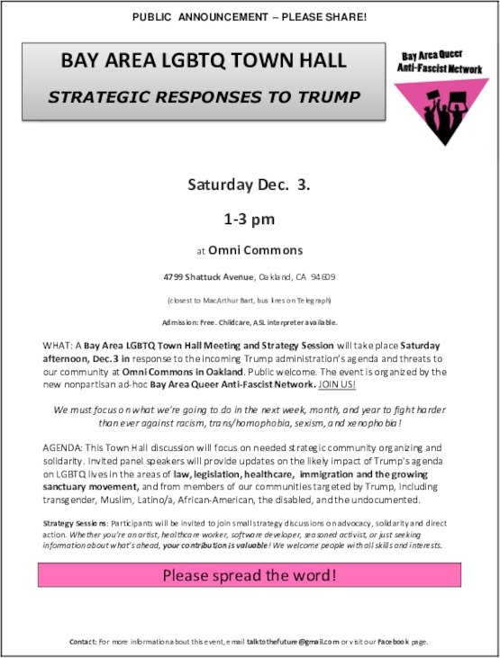 Bay Area LGBTQ Town Hall Meeting and Strategy Session in response to the incoming Trump administration’s agenda and threats to our community.