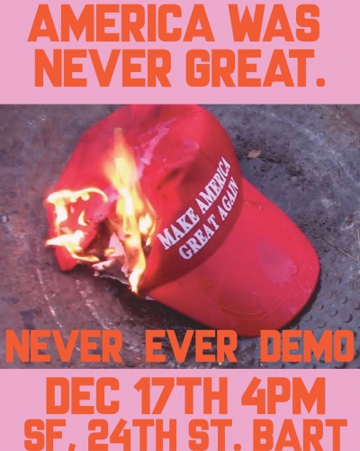March in the streets with homies & comrades: America was never great. It has always been a country where indigenous, black, brown, migrant, queer and trans folks y muchos más have been systematically exploited and attacked by the police, the state and fascists. This has been the colonial tradition of America. With the rise of yet another fascist as president on stolen land, the threat to our lives and communities deepens and we need to defend ourselves and each other, together, with all the love & rage that we feel. This action is to show our resistance and make our presence visible. Community collectiveness is necessary and healing, aqui estamos and we have each other's back. Let's make the Mission and all of our neighborhoods places where racists and bigots are afraid to go - para siempre, always.