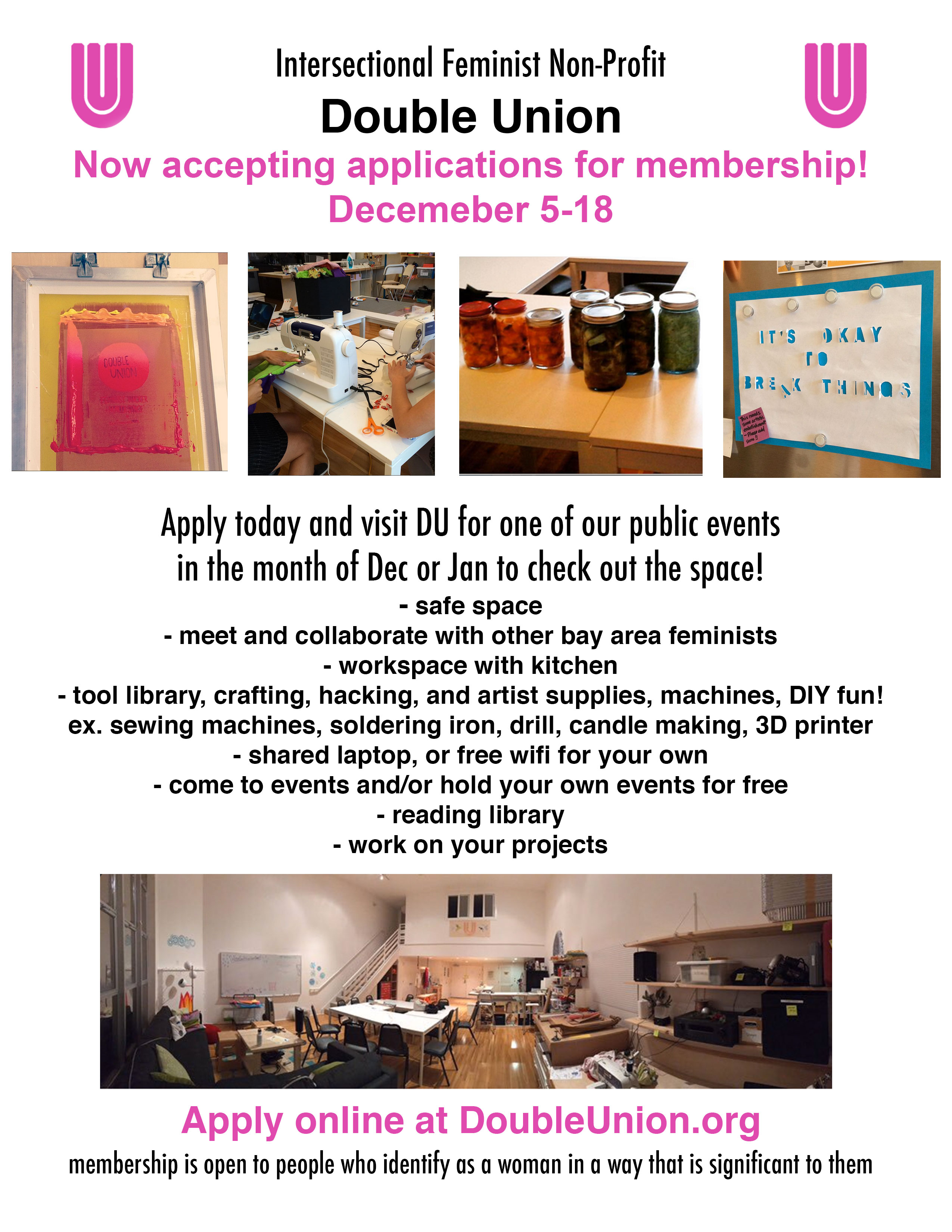 This event is being hosted at Double Union, and Double Union's membership applications are also now open from Dec 5- Dec 18, come to the event and see the attached flyer if you are interested in becoming a member!