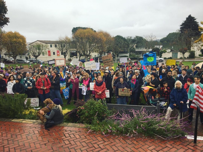 Join us in rejecting Trump's blatant misogyny, racism, religious bigotry and xenophobia. Help make our community a safe place for immigrants, LGBTQ people, Muslims, people of color, women and anyone else whose human rights and human dignity are threatened by the Trump regime. Stand with us to protect women's right to full reproductive health care, workers' right to receive fair wages and to organize unions, and our children's right to a livable world without catastrophic climate change. We are Black, Latinx, Native, Arab and white, women, trans and men, young and old, queer and straight, documented and undocumented, people with disabilities, in a union and not unionized, and members of every faith and belief. We are one community and we won't be divided.