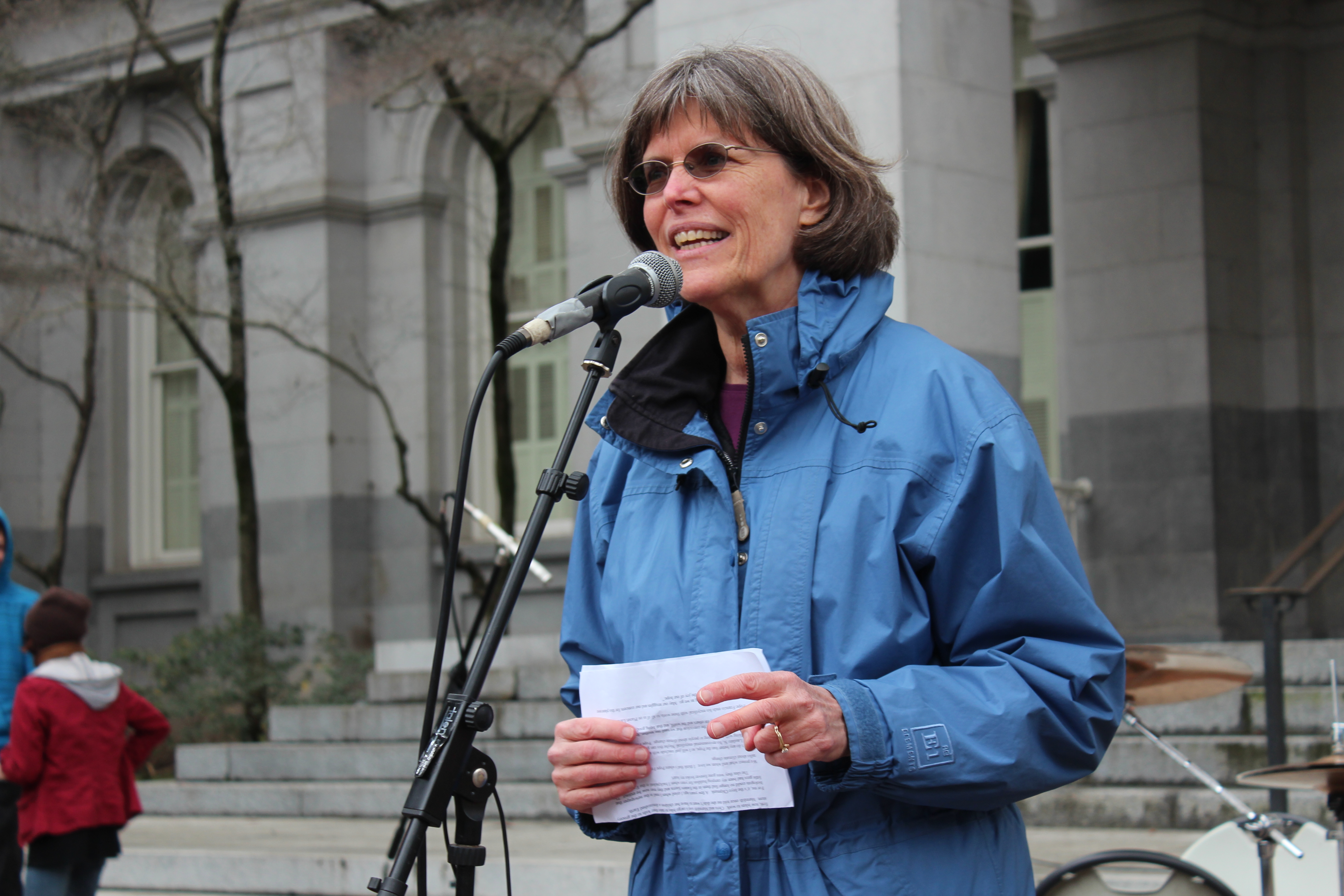 Elizabeth Patterson, the Mayor of Benicia, discussed the successful campaign to block oil trains carrying Bakken Crude Oil from going through the city, and outlined seven concrete things that people can work for in order to replace fossil fuel with green energy: