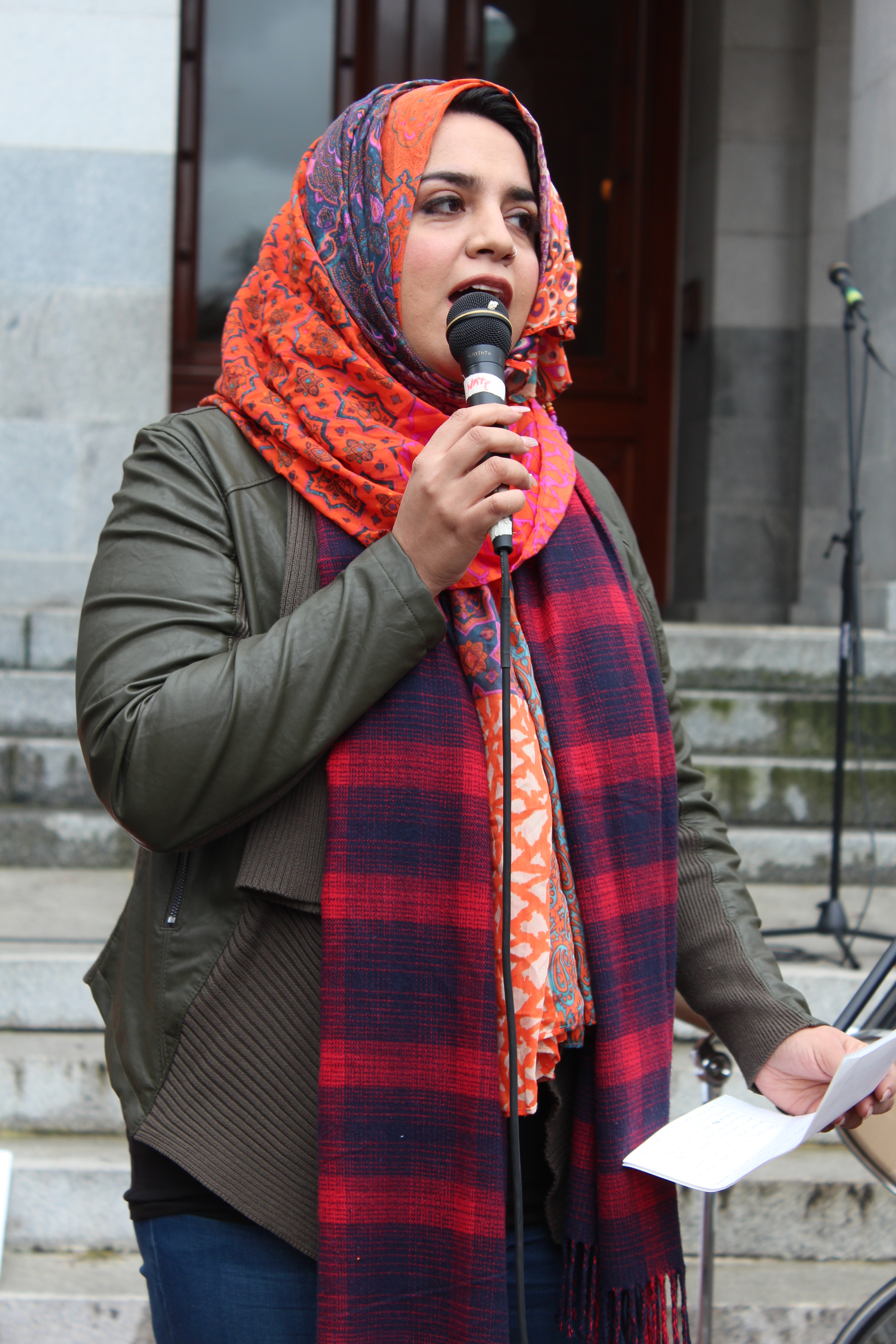 Saeeda Islam, of Pakistani and Mexican descent, told the crowd she decided to wear the hijab as “my first feminist declaration when I was 18 years old as an act of liberating myself.”
