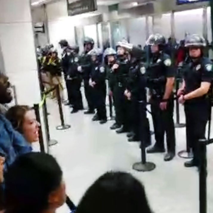 Airport demonstrations continued throughout the US on Sunday. In Northern California, not only San Francisco but Sacramento, San José, and Fresno airports also saw demonstrations. Around 60 people gathered by 6am at SFO to demonstrate. By noon the demonstration included over 1,000 protesters. All international departures gates were blocked, with human barricades actively blocking big guys trying to push through to their flights.