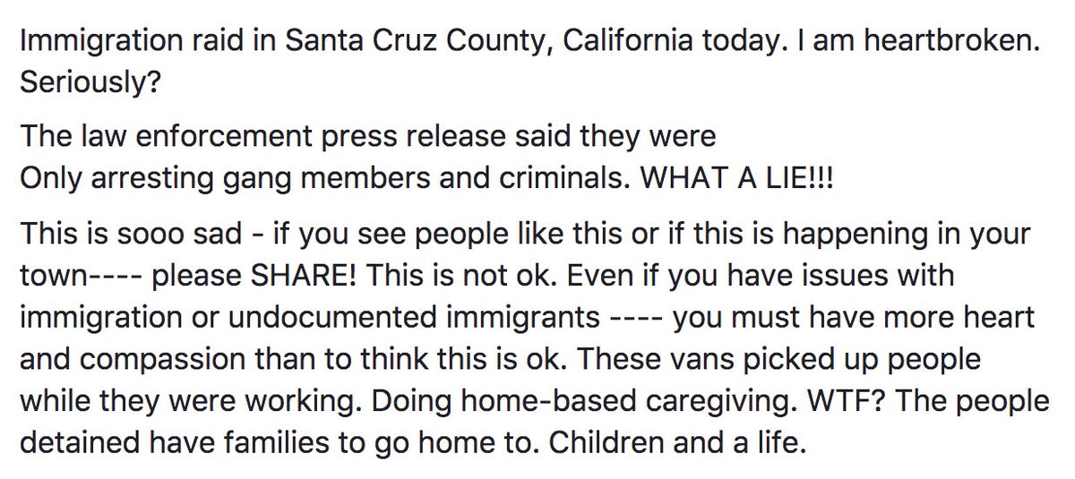 But, in light of Trump's recent threats to deport citizens without documents, the people of Beach Flats are terrified. "This morning's raids threw the immigrant community into a panic. Trump's new mandate to prioritize deportation of a far broader swathe of the immigrant community means many, many more people — parents, families, ordinary working people — must be fearful. Many are now in hiding," said Paul Johnston of the new community organization Sanctuary Santa Cruz.